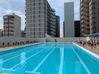 今日は1時間目から1年生がプールに入りました。