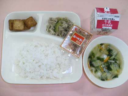 年に1回、7月のみ登場するゴーヤ(にがうり)と豚肉、もやしを使用しています。一般的には卵が使われますが、給食では卵は使用していません。食べる時に小袋のかつおぶしをかけることで、風味と旨みを添えています。