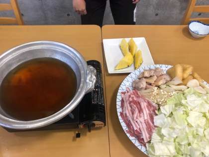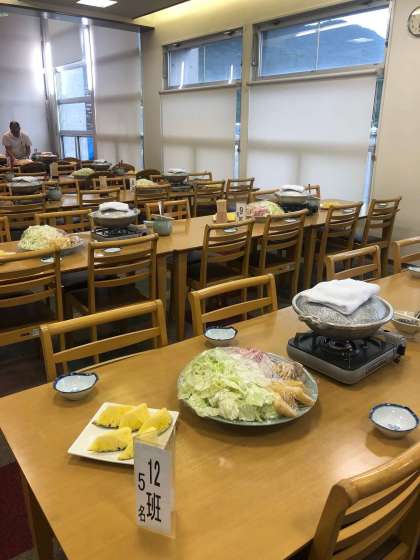 食堂がいつもより、クーラーが効いているなと思っていたら、あっ、そうか夕食は、鍋!高原野菜がたっぷりです。