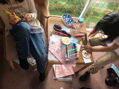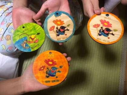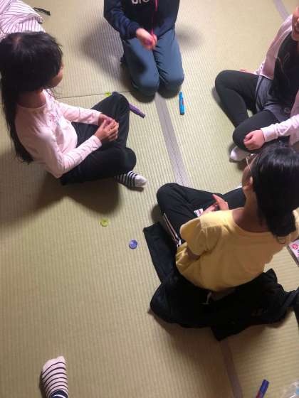 お風呂に入って、コースター作りや、生活班でおしゃべりや、遊びやら、ゆったり過ごしています。この後は、夕食です。