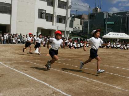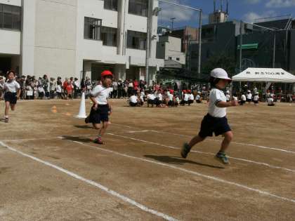 1年生「かけっこ」です。全力で走っています。赤勝て!白勝て!