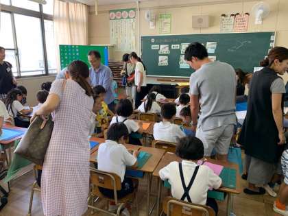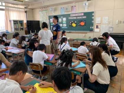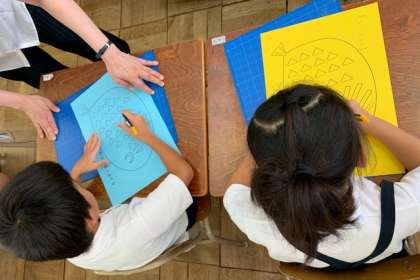 2年生で初めて使うカッター、安全な使い方を確認した後にカッターで画用紙を切り抜き、作品を作りました。