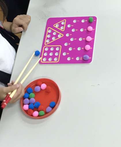 おはしを使って、ふわふわスポンジ玉やビー玉などを穴あきボードに運びます。
