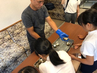 施設の方の説明を聞いて、早速貝を受け取り真珠を取り出しました。中は開けて見るまでわかりませんが、大きくて立派なもの、小さくて可愛らしいもの、色合いもそれぞれ微妙に違っています。取り出した真珠を各自洗いに行き、名前カードが入っている小袋に入れます。後日自分が選んだキーホルダーに加工して学校へ送っていただきます。届くのが今から楽しみです。