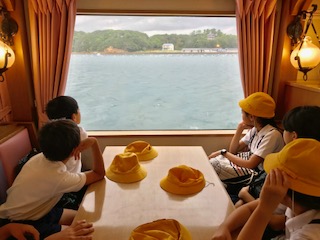 時間通りにエスパーニャクルーズ乗り場に到着し、船の室内から出港です。