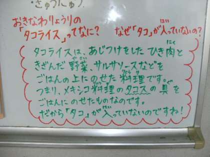 「なんでタコライスっていうのにタコが入ってないの〜?」と多くの子どもたちから質問があったタコライスの名前の由来を、給食室前のホワイトボードに紹介しました。「沖縄で食べたことある!」と教えてくれた子どももたくさんいました(^^)