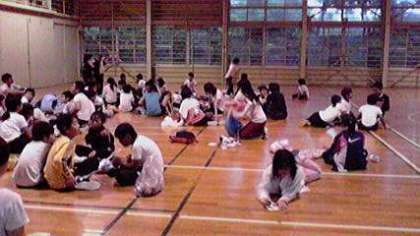 お風呂タイムで、順番でお風呂に入っていない子は体育館にいます。はがきを書いたり、スタンツの練習をがんばっています。