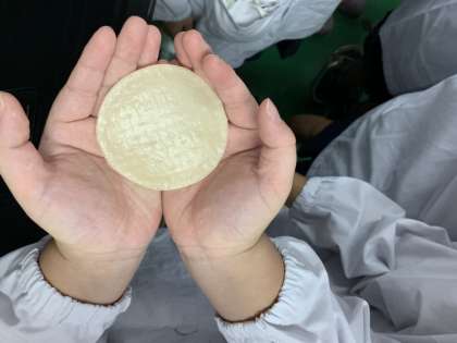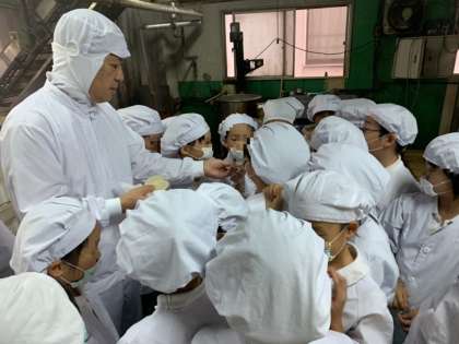 大量のもち米を一気に蒸し上げる様子、おせんべいが大量に揚がる様子など、おせんべいができるまでの様子を見学させていただきました。