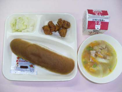 しょうが汁で下味をつけたまぐろにでんぷんをまぶして揚げ、ケチャップ、砂糖、赤みそで作ったタレをからませた、魚の臭みがない子どもたちに好評な献立です。