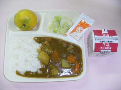 豚肉を主材に、小麦アレルギーの児童に配慮した米粉のカレールウの素で味つけした、毎回好評な献立です。
