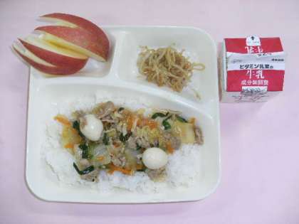 「うずら卵」の個別対応献立です。卵アレルギーをもつ子どもに、うずら卵を除去した具を提供しています。