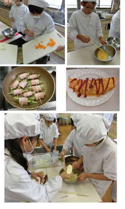 「チーズ・野菜入りオムレツ」や「野菜のベーコン巻き」、「ポテトサラダ」に「ほうれん草のおひたし」などなど、材料を切ったり、ゆでたり、いためたりと役割分担をしながら取り組みました。