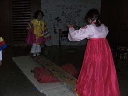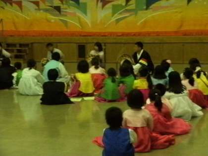 民族講師の先生(ソンセンニム)の楽しい劇を見て、韓国朝鮮の国の成り立ちを学びました。