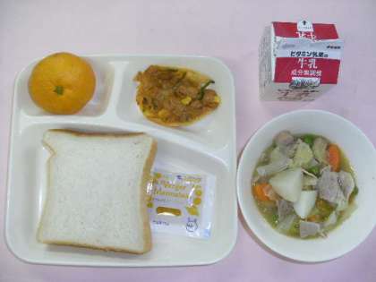 ツナ、コーン、ピーマン、ピザソース、チーズを混ぜ合わせたものをぎょうざの皮に給食室で1枚ずつのせて焼いた、一口サイズのピザです。