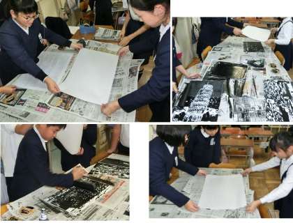 友達と協力して刷りあげた版画は、各学級に掲示し、個人懇談会で見ていただけるようにしています。