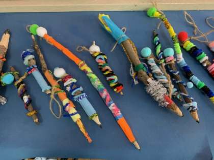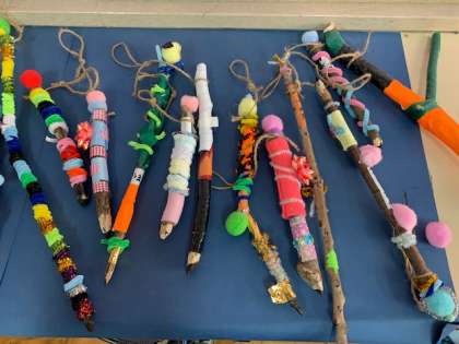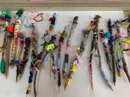 その枝にモール、マスキングテープ、毛糸、ビーズなどで飾り付けをしました。先はカッターで削りました。