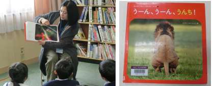 2冊目は「うーん、うーん、うんち!」です。子どもたちは「小さい」「大きい」「どれ?」と口々に話しながら興味深々で絵本に見入っていました。
