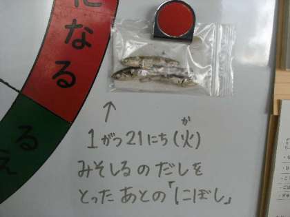 給食時間に行ったクイズは「きょうのみそ汁のだしは何からとっているでしょう?」