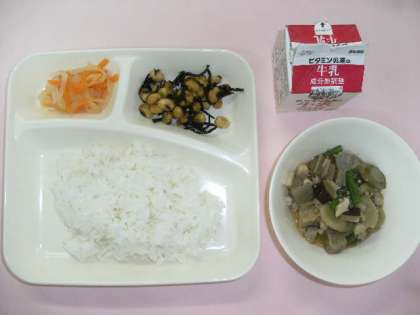 今日は給食週間の3日目です。今日のクイズは「今日の給食の『紅白なます』の紅白とは あかとしろ という意味ですが、紅白なますの白い食べ物はなんでしょう?」