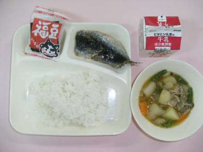 豚肉、じゃがいも、だいこん、にんじん、ごぼう、しめじ、三度豆を使用した煮物です。