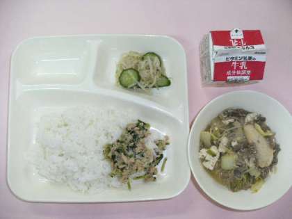 子どもたちが大好きな献立です。牛肉を主材に、ふ、糸こんにゃく、とうふ、はくさい、白ねぎなどを使用しています。