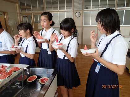 夏休みに入る直前、飼育栽培委員会の皆さんと管理作業員さんが心を込めて水やりを続けた成果であるスイカを試食しました。