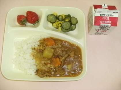 しかし、新型コロナウイルスをはじめとする感染予防対策および拡散防止のため、中止となりました。みんな楽しみにしていたので、とても残念そうでした。気持ちを切り替え、子どもたちは人気メニューのカレーライスやいちごに大興奮で、今日もおいしくいただきました。