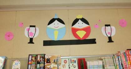 3月2日(月)は今年度最後の「よも☆よも」さんと、6年生への読み聞かせの予定でしたが、残念ながら実施できませんでした。ですが「よも☆よも」さんが、聖和図書館の中に、季節を感じさせるかわいらしいお雛さまをつくって掲示してくださっています。