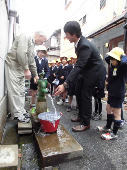 今日11月20日(木)に、1組と2組別々に時間をずらして、校区内にあるポンプの見学に行ってきました。おうちの方が、ポンプがいつから使われているのか、どのような仕組みになっているのか等を、丁寧に説明してくださった後、子ども達は実際にポンプを押したり、出てきた水を触ったりさせてもらいました。一年を通じて17〜18度の水温が保たれているそうで、冬は温かく、夏は冷たく感じられるそうです。最後に、しっかりお礼の挨拶をして帰ってきました。
