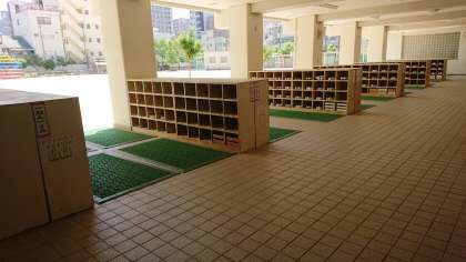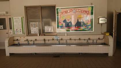 きょうしつに もどるときは、くつばこで くつを はきかえてから てを あらいます。てあらいばは、くつばこの ちかくや きょうしつの ちかくに ありますよ。せっけんで きれいに てを あらってから きょうしつに はいります。とうこうびに やってみましょうね。