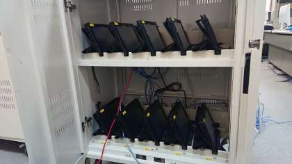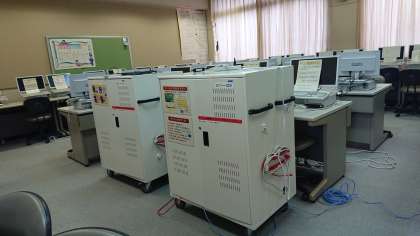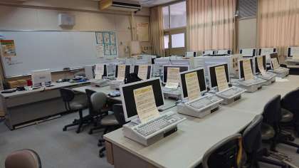 ここには、ぱそこんが たくさんありますね。この おへやの なまえは 「ぱそこんるうむ」です。40だいの ぱそこんと たぶれっとが あります。