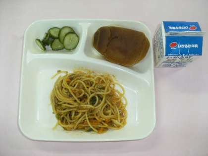 スパゲッティミートソースは子どもたちに大人気のメニュー!調理員さんも、子どもたちが大好きなメニューだからこそ、より一層気合いを入れて作られていましたよ。全学年、完食です!