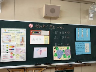 まず図工の時間に初めて絵の具で色をつくりました。