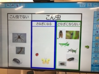 NHK for school『ものすごい図鑑』などで見ながら、昆虫とそうでない虫に分けました。