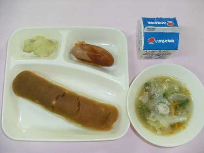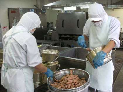 ゆでたフランクフルトに、ケチャップとデミグラスソースとウスターソースを合わせて片栗粉でとろみをつけたソースをかけています。写真左は、ゆでたフランクフルトをクラスごとの人数分に1本1本数えて入れておられる様子です。