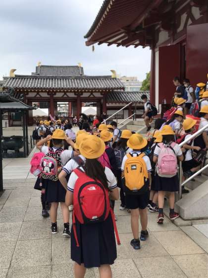その後は徒歩で四天王寺へ行き、教科書で学習した古い建物を色々な角度から見てみんなで帰校ました。