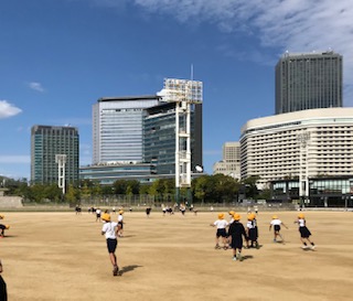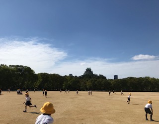 お弁当を食べた後は、大阪城が見える広場で、思いっきり走り回りました!「運動場よりもすごく広い!」と、とっても嬉しそうでした。