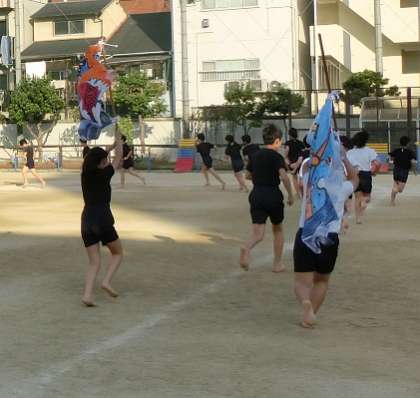 今月始め頃から作ってきた大漁旗も仕上がり、今週から実際に入退場の練習でも太鼓の音に合わせて使用しています。