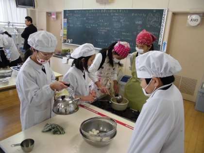 10日(火)5年生の家庭科の学習で、みたらし団子と緑茶をつくりました!!今回は、1組と2組合同で、みんな仲良く、協力してつくりました。白玉粉を水で溶かした後、ちょうど良い大きさにみんなで丸め、わかしたお湯でやわらかくなるまでゆでました。たれも手作りで、とろみがでるまでゆっくりとかきまぜました。ぷるぷるのやわらかい作りたてのみたらし団子に、みんな大満足でした♪♪とってもおいしかったです(^_^)
