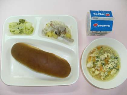 もち米に焼き豚、くり、しいたけ、調味液を加えて、蒸し焼きにしています。チキンブイヨンとごま油でコクと旨味をだした、子どもたちに人気の献立です。