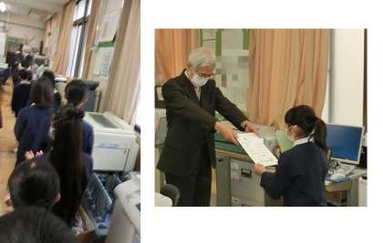 今はチームズでの児童朝会のため、表彰される児童は職員室のパソコン前に並び、校長先生からの表彰の様子が各教室の画面へ伝わるように行われました。