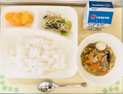 今日の八宝菜には、玉ねぎ、キャベツ、にんじん、たけのこ、ピーマン、しいたけ、うずら卵を使っています。色々な食材のうま味が合わさり、おいしさも栄養も満点の献立でした。