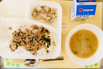 豚ひき肉とにらの他に、にんにく、しょうが、にんじん、玉ねぎを使っています。ご飯によく合う味付けで子どもたちに大好評でした。