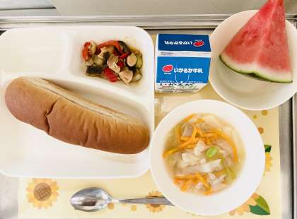 なす、きゅうり、赤ピーマン等の夏野菜をたっぷりと使っています。野菜のおいしさが味わえる献立で、子どもたちにも大好評でした。