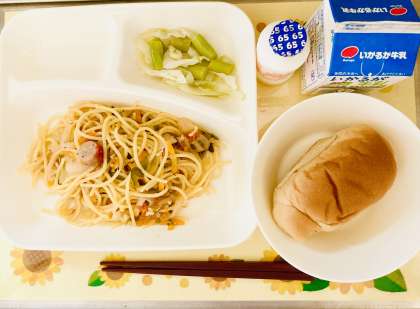 トマト缶詰、塩、粗挽きこしょう、薄口醤油などで味付けし、バジル(乾燥)で風味付けしています。具だくさんで彩りも良く、大好評でした。