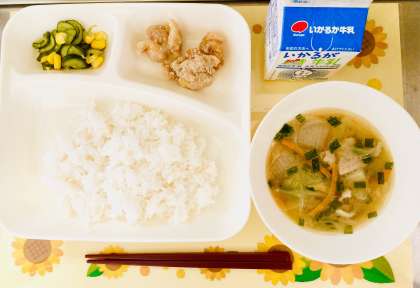 野菜や豚肉がたっぷり入ったスープは、味噌を使った中華風の味付けで、ご飯によく合い、子どもたちに大好評でした。