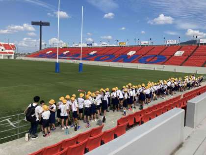おいしいお弁当を食べた後には、花園ラグビー場へ見学に行きました。プロの選手が使っている場所にも行くことができました。そのあと、大きな公園へ。1日の疲れも吹っ飛ぶ楽しさでした。
