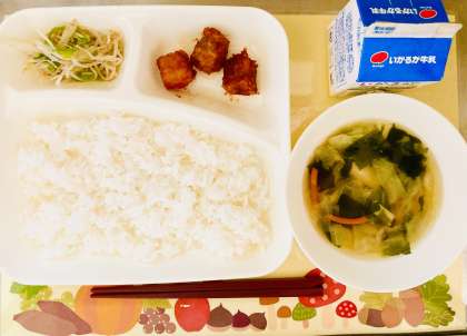 鶏肉、野菜、わかめ等がたっぷり入ったすまし汁です。具材も出汁も美味しく食べられる献立でした。