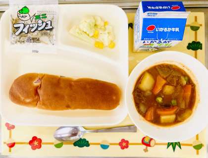 ブラウンルウは給食室で作り、デミグラスソース、ケチャップなどを使って味付けしています。温かいシチューは、子どもたちに大人気の献立です。今日もおかわりの列ができるほど大好評でした。