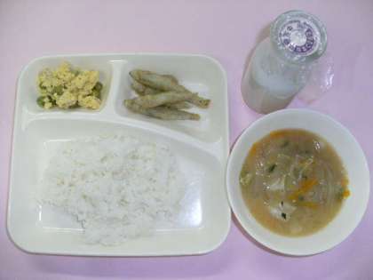 えんどうは、ひとつひとつさやから出してゆで、調理しています。旬を味わえる献立です。